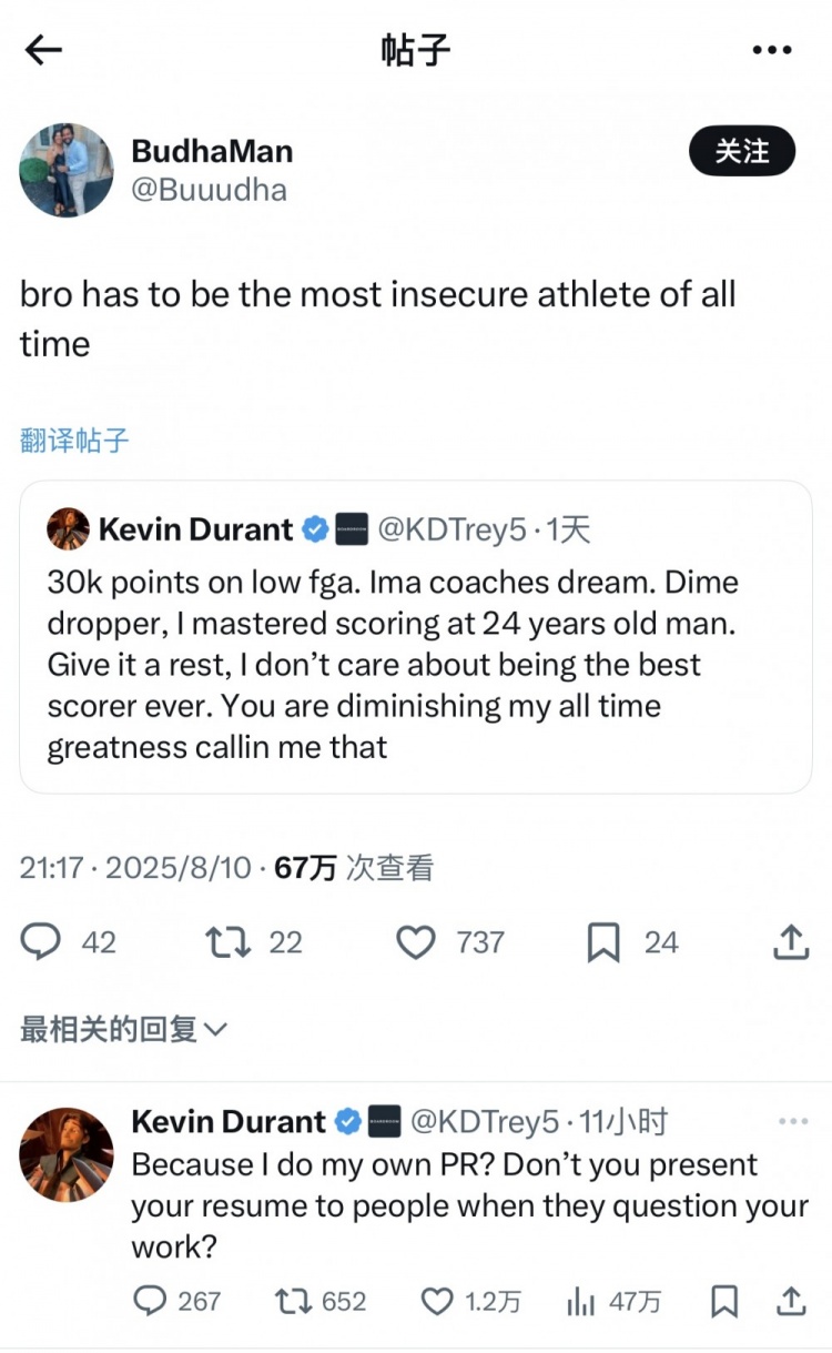 24直播网8月11日讯 近日,火箭前锋杜兰特连续在社媒X上与球迷对线。球迷A:“最近一次杜兰特的场均出手次数领跑全队还是在2018年。”球迷B:“史上最伟大的得分手?扯淡!你们更喜欢...